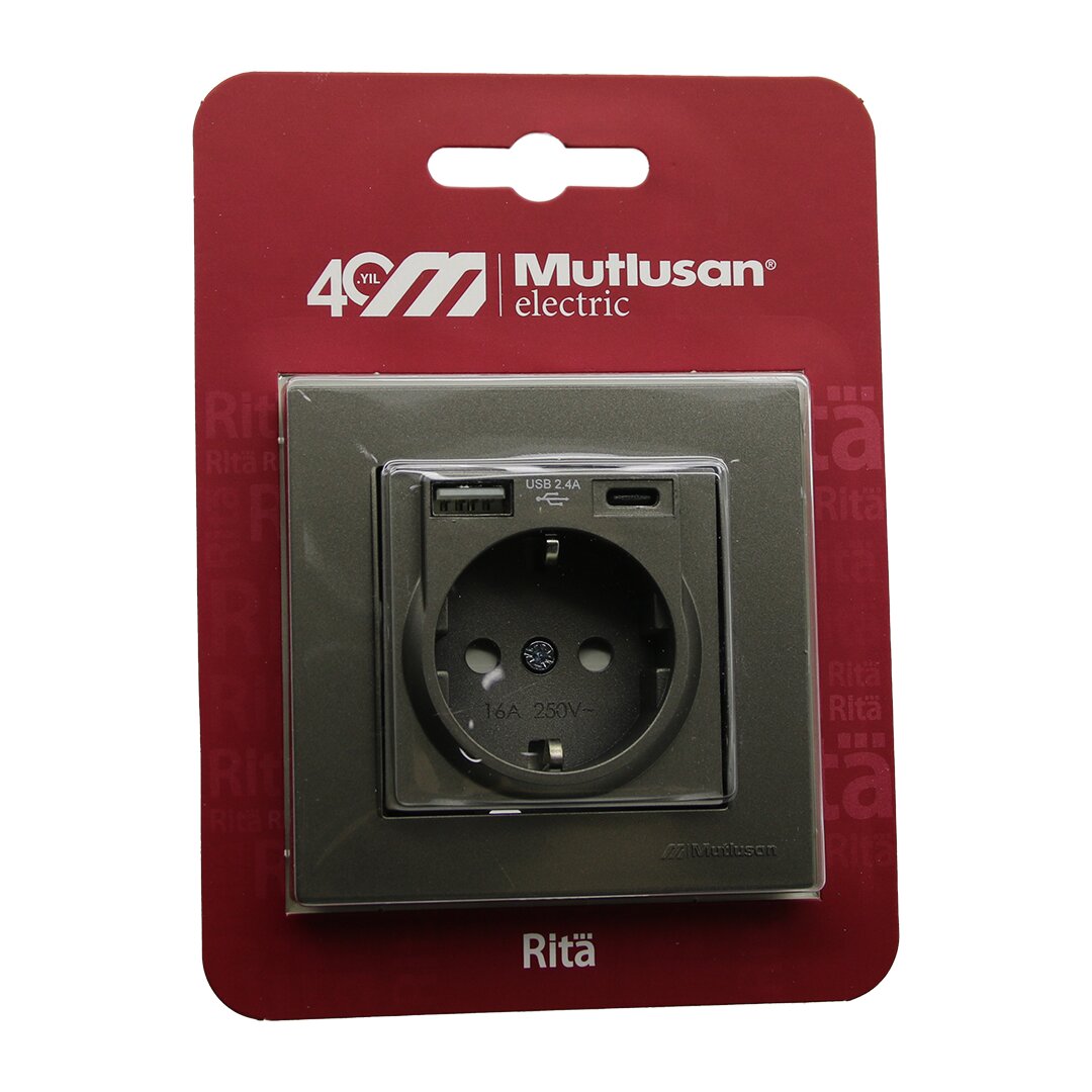 MUTLUSAN RİTA-2220 629 0286 BLİSTERLİ - KARTLI ANTRASİT - USB + TYPE-C ' Lİ TOPRAKLI PRİZ ÇERÇEVELİ