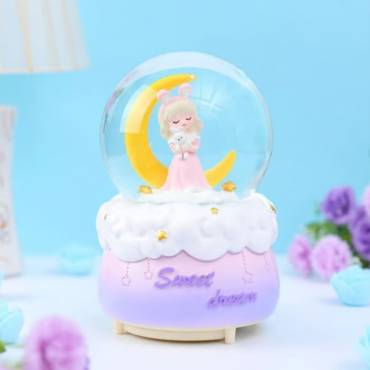 Pilli Işıklı Müzikli Kar Küresi–Hilal Ay Önünde Prenses Figürlü Eğlenceli Masaüstü Biblo, LED Aydınlatmalı Dekoratif Hediyelik Kar Küresi