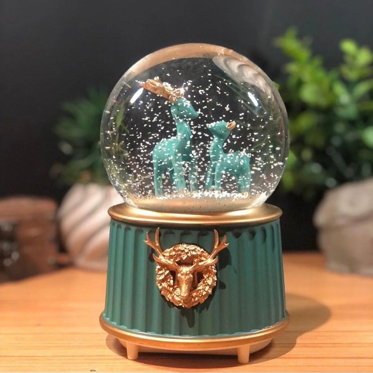 Pilli Işıklı Müzikli Kar Küresi–İki Geyikli Yeşil Figürlü Eğlenceli Masaüstü Biblo, LED Aydınlatmalı Dekoratif Hediyelik Kar Küresi