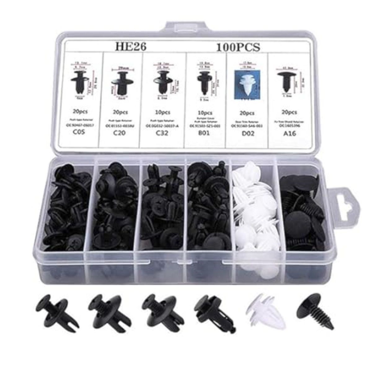 Araç bakım ve onarım işlemlerinde pratik, düzenli ve güvenilir bir çözüm sunan Plastik Bağlantı Elemanları Seti, farklı ölçü ve tiplerde 100 adet oto klipsi ve plastik perçin içeriğiyle çok amaçlı kullanım imkânı sağlar. Tampon, kapı döşemesi ve trim parçalarının sabitlenmesi için idealdir.