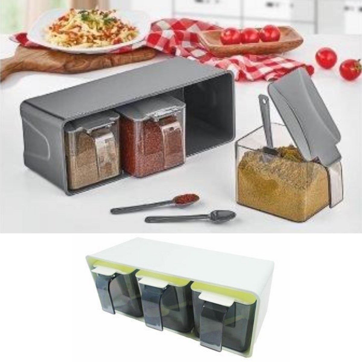 Üçlü baharatlık sayesinde baharatlarınızı ayrı ayrı bölmelere yerleştirir ve daha düzenli bir kullanım avantajına sahip olursunuz.