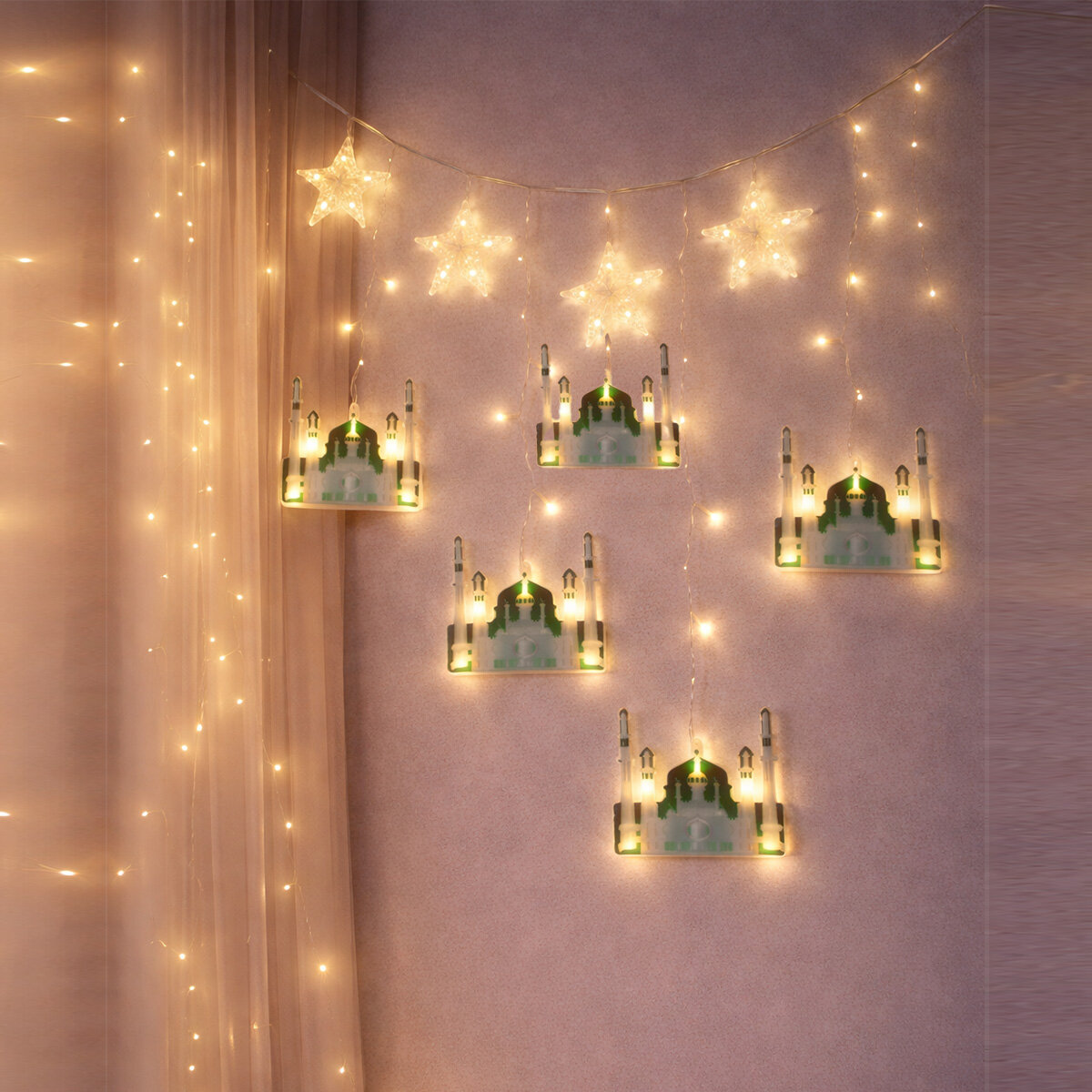 3MT FİŞLİ - EKLEMELİ RAMAZAN DEKOR LAMBA - PERDE LED YEŞİL CAMİ - YILDIZ